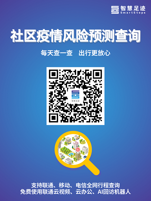 當(dāng)前,很多地方陸續(xù)迎來(lái)返程復(fù)工高峰為支持企業(yè)復(fù)工復(fù)產(chǎn),方便公眾返程暢通智慧足跡重磅升級(jí)“社區(qū)級(jí)疫情風(fēng)險(xiǎn)預(yù)測(cè)”查詢工具全新上線中國(guó)聯(lián)通、移動(dòng)、電信全網(wǎng)個(gè)人行程查詢?nèi)肟谑欠袢ミ^(guò)疫情高發(fā)地區(qū)即刻掌握助力聯(lián)防聯(lián)控,為公眾生活和出行、政府防控部署提供支撐掃描或識(shí)別下圖中二維碼,無(wú)需安裝立即使用用戶僅需在“區(qū)縣預(yù)測(cè)”查詢頁(yè)面輸入聯(lián)通/移動(dòng)/電信手機(jī)號(hào)碼獲取并正確填寫(xiě)驗(yàn)證碼同意授權(quán)后即可獲得查詢結(jié)果助力科學(xué)防
