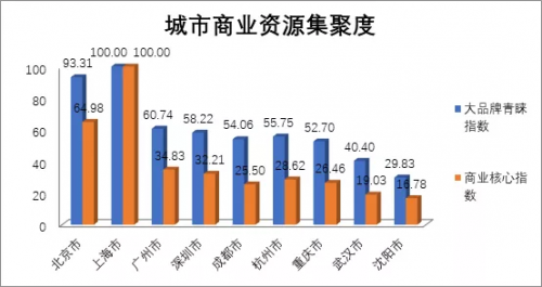 對于北京的夜經濟來說,不缺少供“買買買”的消費資源。我們以上海大品牌青睞指數為基準(100),北京大約是93,僅次于上海,兩城商業資源集聚度遠高于其他城市。廣州(60)、深圳(58)、杭州(55)、成都(54)、重慶(52)對大品牌商業資源的吸引力就差了很多。武漢(40)、沈陽(29)更是差距頗大。