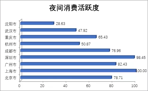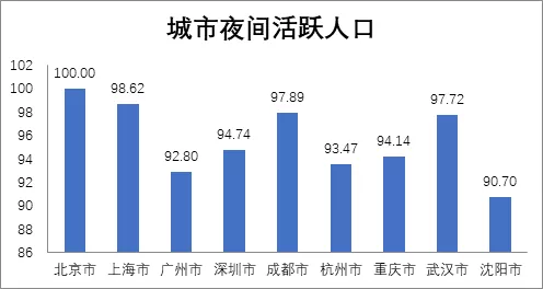 從夜間活躍人口來看,北京、上海、成都、武漢夜間人口活躍度最高,以北京為基準(100),上海是98,成都、武漢都是97,與北京、上海相當。