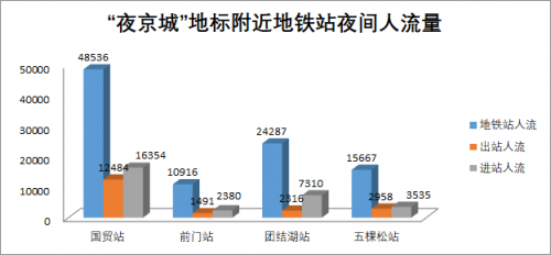 以前門和大柵欄、三里屯、國貿、五棵松首批“夜京城”地標為例。地鐵延時運營后,8月份地鐵1、2號線周邊夜生活人流量大約在13萬左右,我們選取離4個“夜京城”地標最近的地鐵國貿站、前門站、團結湖站和五棵松站進行分析。