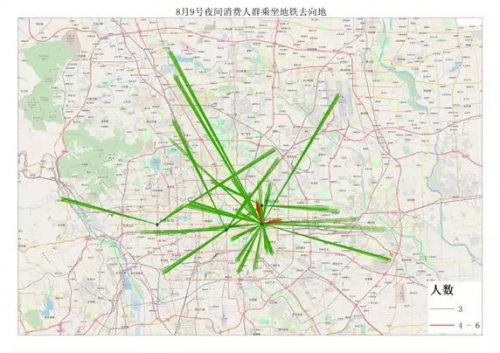 巨大的夜間人流背后,是遙遠的出行距離。從消費人群的流向來看,在國貿商圈消費的人群重點來自東城、西城、朝陽、豐臺四個區,三里屯商圈的主要消費人群來自朝陽、昌平和順義,五棵松商圈的消費人群主要來自石景山,前門大柵欄商圈消費人群主要來東城、西城、海淀和豐臺。