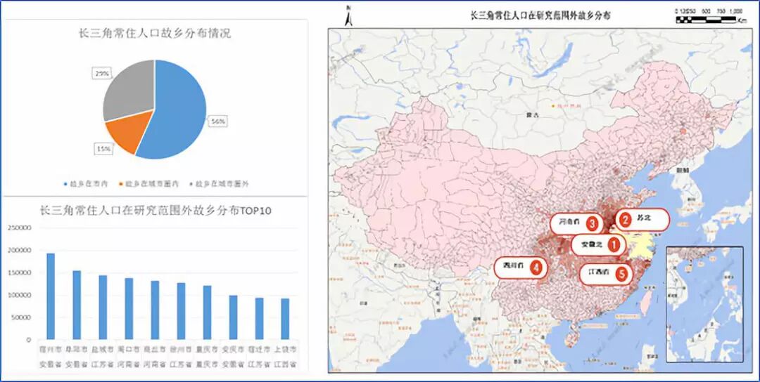 外來濃度:分析都市圈城市本地常駐人口的春節目的地,推測該群體其故鄉分布。利用年齡段與歸屬地等屬性對人口進行劃分,了解各類人口構成比例和靜態聯系,結合空間分布信息,測算不同類型人口的結構特點,深度反映了片區的各類人口真實情況。