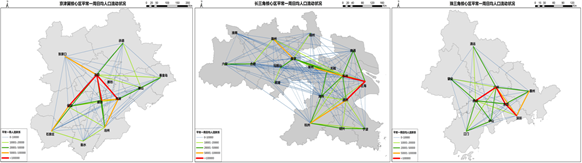 聯系強度:基于日均的城市間來往用戶量測算區域之間的聯系強度。通過數據識別在居民在區域內各個城市之間出行軌跡,以人員流動方向和數量表征城市相互之間聯系強度、聯系范圍,由此分析和劃分都市圈體系等級結構。