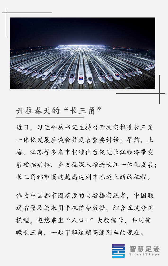 正式開啟新征程的“長三角都市圈”號高速列車準備的怎么樣了?中國聯通智慧足跡依托手機信令脫敏數據從“人口+”大數據視角,以首位度、人口熱度、聯系強度、外來濃度和發展厚度等五大維度,重新看看長三角都市圈的發展現狀和特點。